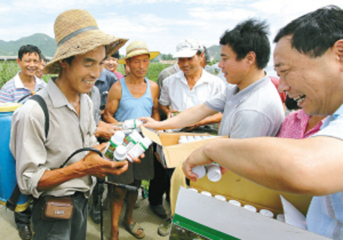 连日来,江北区农林水利局组织小分队深入辖区蔬菜基地,向菜农推广新型生物农药。这种新农药无毒、无污染,且能抑制菜虫快速生长,有效缩短蔬菜上市间隔期,确保夏令菜市场供应。图为该局农技人员在庄桥街道居陆村向菜农赠送新农药。