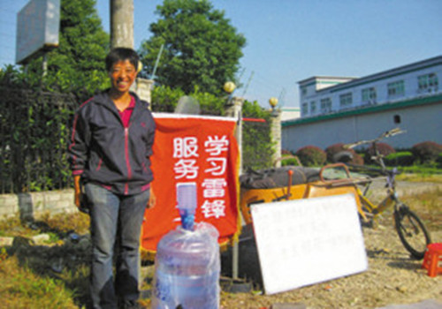 芦大姐的修车摊很简陋,四把塑料小凳,一个工具袋,一个打气筒,一大桶纯净水和一块写有“免费修理免费供水”的白板。此外,最引人注目的是一面印有“学习雷锋服务民工”的红色旗帜。芦大姐说,她没有专门学过修理,只是看多了别人修车才学会的。“打气、补胎、修链条,会修的我一定帮忙。”