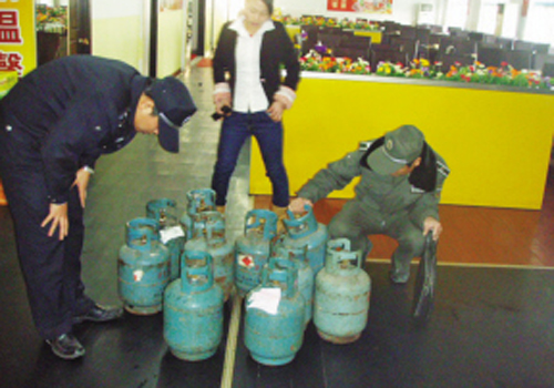 7日,联合检查组已抽查了包括2家火锅店的4家餐饮单位,共发现了11只“过期”燃气瓶。这些“过期”燃气瓶,或是超期未检验或是已经检验为不合格了,但仍被放在火锅餐桌下使用。执法人员对这些燃气瓶进行了查扣处理。