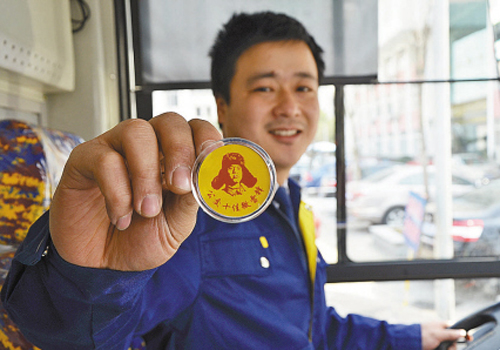 昨日下午,市公交总公司下属的永昌公司,首批被评选为“公交微雷锋”的10位公交驾驶员师傅高兴地接过了象征着荣誉的“雷锋徽章”,今后他们将佩戴着该徽章上岗服务。